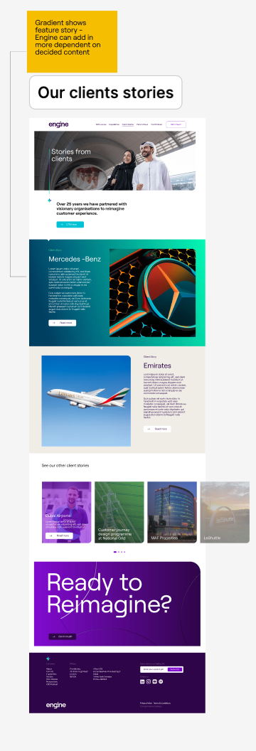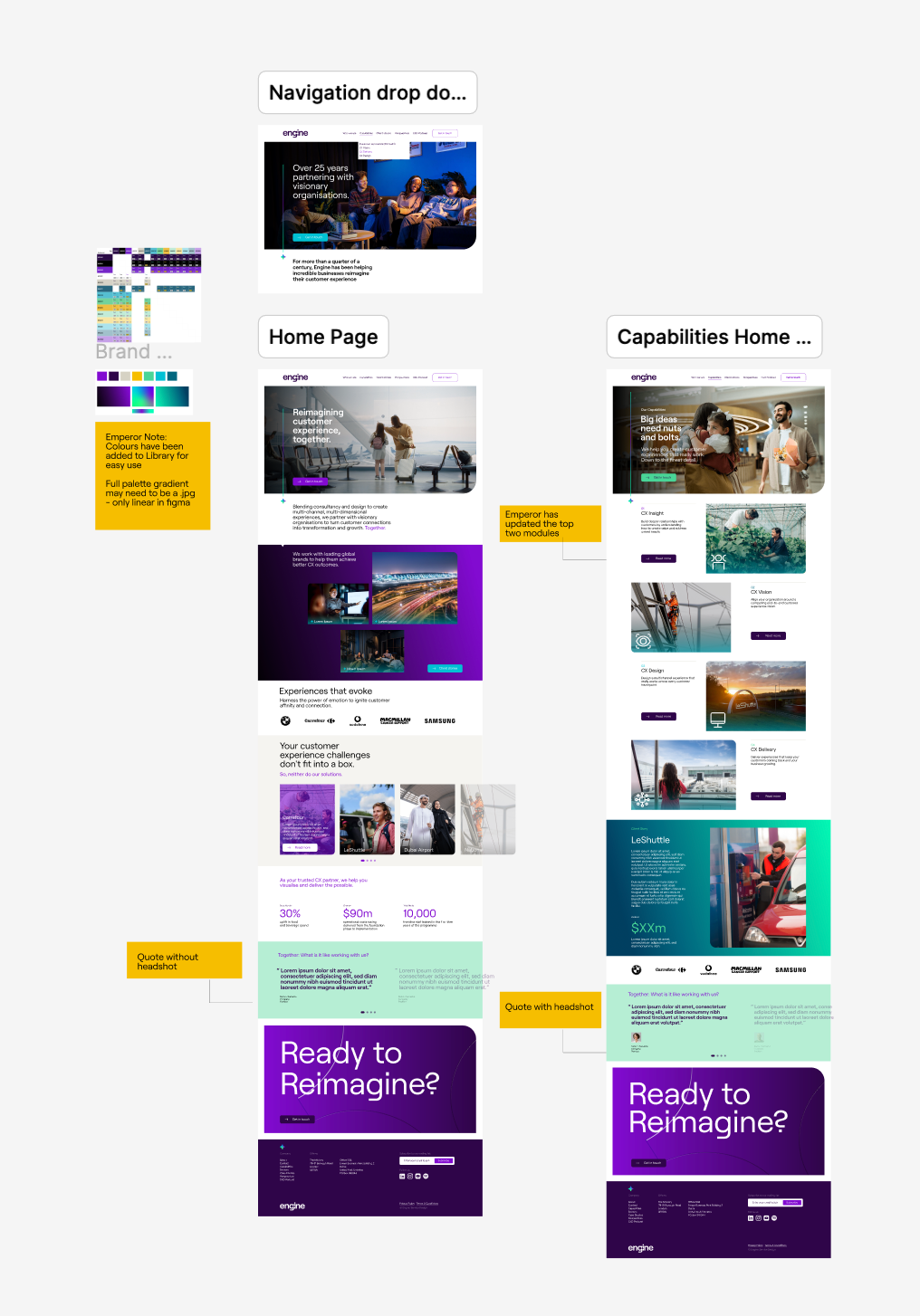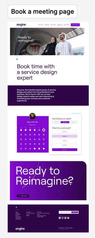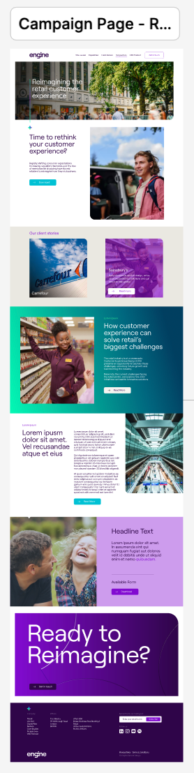 As part of a branding project at Emperor Design agency, I was responsible for creating wireframes in Figma to guide Engine’s website development partners. The goal was to design a series of modular components compatible with their chosen platform, HubSpot, minimising the need for custom builds while maximising the brand’s visual impact.