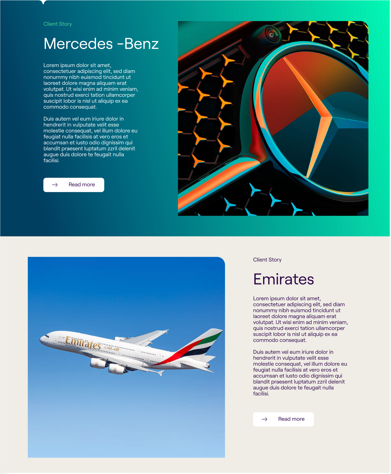 Case Studies were designed to stand out with high impact colour gradients. Details such as the single curved corner on headshots or the north star cut out between modules allows us to interweave small branding details throughout and create a website with a more bespoke feel.